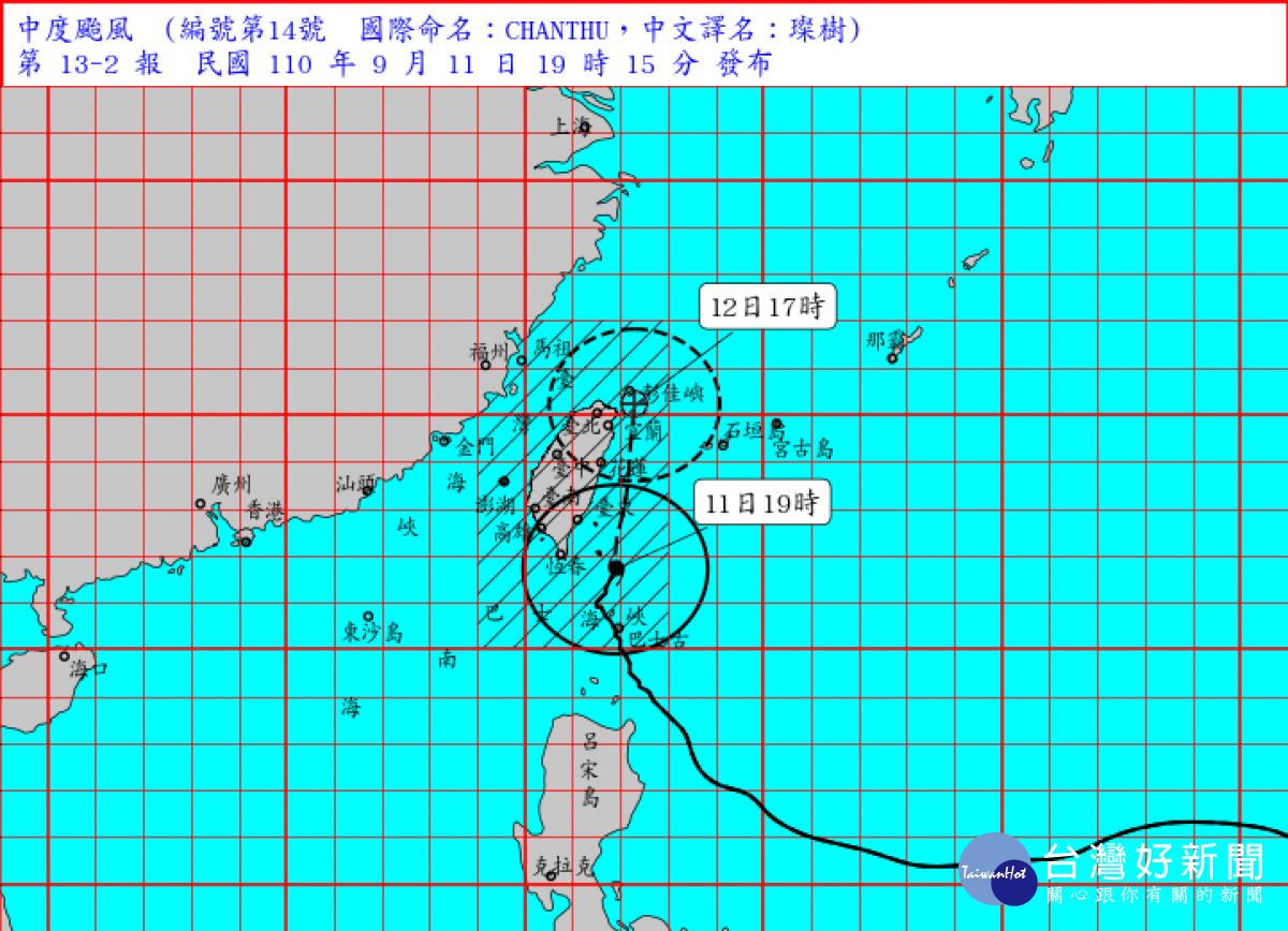 台灣英文新聞生活組 台北綜合報導璨樹颱風今11日轉為中颱逐漸往北移動帶來雨勢 根據最新氣象資料顯示第14號颱風璨樹過去3小時強度略為減弱中心目前在鵝鑾鼻東南方海面向北移動其暴風圈逐漸進入台灣東南部及南部陸地並逐漸往北移動對台灣陸地構成威脅.